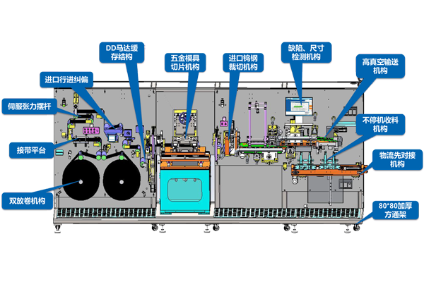 本設備主要用于方形鋰離子動力電池正負極片的成形,采用五金模具裁切成形,適用于連續涂布工藝。極片卷料自動放卷糾偏,經張力控制系統,過程糾偏系統,引入到模具工位,送料機構牽引輸 送極片,五金模具裁切極片成形極耳。裁斷機構自動分切成片,真空皮帶吸附分切后的極片輸 送到料盒內,自動剔除視覺檢測設備識別的不良品。